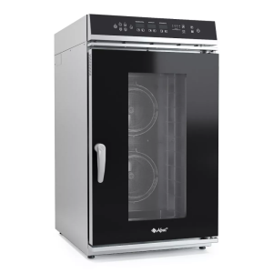 Оборудование оснащено дверцей с вращающейся ручкой и прозрачным окном, а также удобной панелью управления с мембранными кнопками, LED-подсветкой и цифровыми экранами, что делает эксплуатацию простой и интуитивно понятной. Камера выполнена из прочной нержавеющей стали, включая лопасти вентиляторов и направляющие для противней, что гарантирует продолжительный срок службы и лёгкий уход. Чёрная отделка дверцы и верхней панели придаёт оборудованию стильный и современный облик.