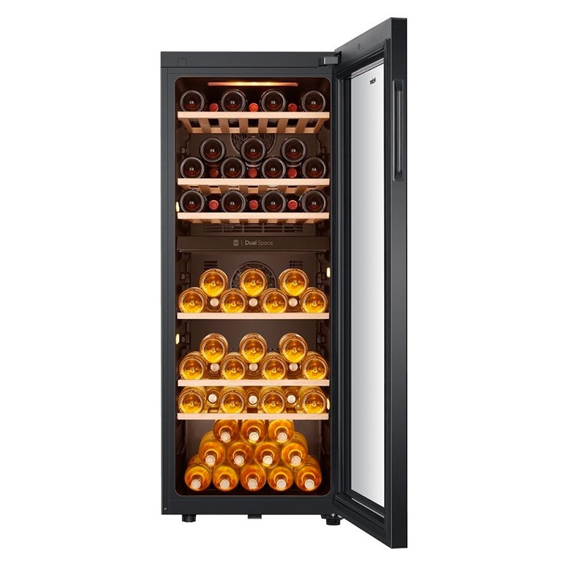 Этот винный шкаф способен вместить до 77 бутылок стандартного формата «Бордо». Конструкция предусматривает возможность организации двух отдельных климатических зон, что дает возможность поддерживать идеальные условия для хранения различных сортов вина (к примеру, белых и красных) одновременно. По желанию, шкаф можно настроить на единую температуру для всего внутреннего пространства.