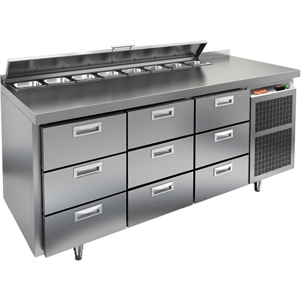 Каталог оборудования Холодильное оборудованиеСтолы охлаждаемыеСтолы холодильные для салатовСтол холодильный для салатов HiCold SL1-333GN (1/3) с крышкой Стол холодильный для салатов HiCold SL1-333GN (1/3) с крышкой Код товара: 064-847 Поделиться: WhatsAppTelegram СравнитьДобавить в КПВ избранное 0 305 992 ₽ В корзину 0 шт Под заказСамовывоз сегодня бесплатно Взять в кредит Купить в лизинг Получить консультацию в WhatsApp Описание Характеристики Отзывы 0 Стол холодильный для салатов HiCold SL1-333GN (1/3) предназначен для использования на предприятиях общественного питания и торговли. Он объединяет рабочую поверхность и охлаждаемый отсек, что делает его удобным решением для хранения, охлаждения и подготовки ингредиентов при приготовлении салатов, пиццы и других блюд. Такая конструкция позволяет повару работать быстрее и эффективнее, так как все необходимые продукты находятся под рукой. Корпус и столешница выполнены из прочной нержавеющей стали, устойчивой к коррозии и легко поддающейся санитарной обработке.Металлическая крышка защищает продукты от загрязнений и сохраняет их свежесть. Особенности модели: Электронная панель управления — точная настройка температурного режима. 9 выдвижных ящика — быстрое размещение и замена продуктов. Вместимость салат-бара — до 8 гастроемкостей глубиной до 100 мм. Автоматические доводчики — комфорт при загрузке/выгрузке. Легкозаменяемые магнитные уплотнители — надежная герметичность. Открытая агрегатная часть — быстрый доступ для обслуживания. Регулируемые по высоте ножки — устойчивость даже на неровном полу. Толщина столешницы, борта и теплоизоляции — 50 мм, что обеспечивает прочность и энергоэффективность конструкции. HiCold SL1-333GN (1/3) — практичное и удобное решение для профессиональной кухни, обеспечивающее удобную подготовку и хранение ингредиентов. Изображение товара, представленного на фото, может отличаться от его фактического вида. Показать все Габаритные размеры1835×700×850 ммДиапазон рабочей температурыот +2 до +10 °CРасположение агрегатаБоковое Материал столешницыНержавеющая Тип столаС ящиками Объём505 лТип гастроемкостейGN 1/3 Количество ящиков9 штНапряжение220 ВМощность0,46 кВтТип охлажденияДинамическое Тип оттайкиАвтоматическая СтолешницаС бортом Габариты в упаковке2000×850×1000 ммВес нетто130 кгВес брутто185 кгБрендHicold Оставить отзыв Еще никто не оставил отзыв на этот товар Ранее просмотрено Под заказ 107 451 ₽ Стол холодильный для салатов HiCold SLE3-1GN полипропилен, с крышкой