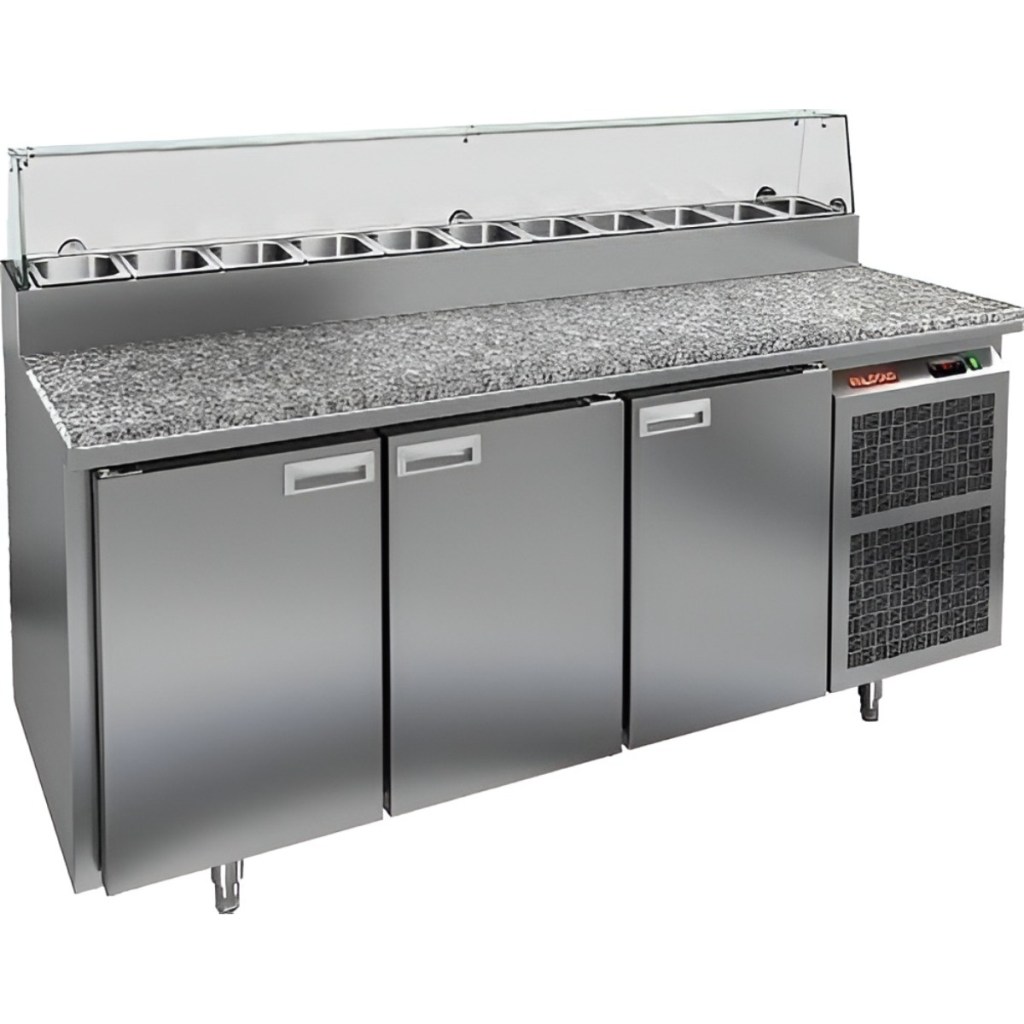 Стол холодильный для пиццы HiCold PZ2-111/GN (1/6H) камень со стеклом (R290) предназначен для предприятий общественного питания и торговли. Он используется для раскатки теста и подготовки ингредиентов, необходимых для приготовления пиццы, салатов и других блюд, а также для охлаждения и кратковременного хранения скоропортящихся продуктов и напитков. Модель сочетает рабочую поверхность с охлаждаемым объемом, что значительно облегчает работу повара, позволяя иметь все необходимые компоненты всегда под рукой.