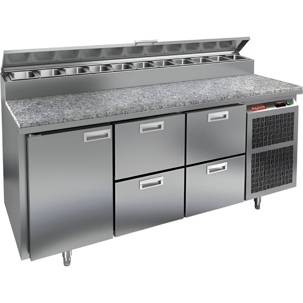 Стол холодильный для пиццы HiCold PZ2-122GN (1/6) камень предназначен для кухонь и предприятий общественного питания. Он используется для раскатки теста, подготовки ингредиентов для пиццы, салатов и других блюд, а также для охлаждения и кратковременного хранения скоропортящихся продуктов. Модель совмещает гранитную рабочую поверхность и охлаждаемый отсек с 1 дверью и 4 ящиками, обеспечивая удобный доступ к ингредиентам и эффективное хранение.