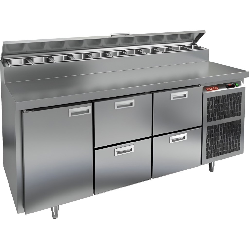 Стол холодильный для пиццы HiCold PZ2-122GN (1/6) предназначен для кухонь и предприятий общественного питания. Он используется для раскатки теста, подготовки ингредиентов для пиццы, салатов и других блюд, а также для охлаждения и кратковременного хранения скоропортящихся продуктов. Модель совмещает нержавеющую рабочую поверхность и охлаждаемый отсек с 1 дверью и 4 ящиками, обеспечивая удобный доступ к ингредиентам и эффективное хранение.